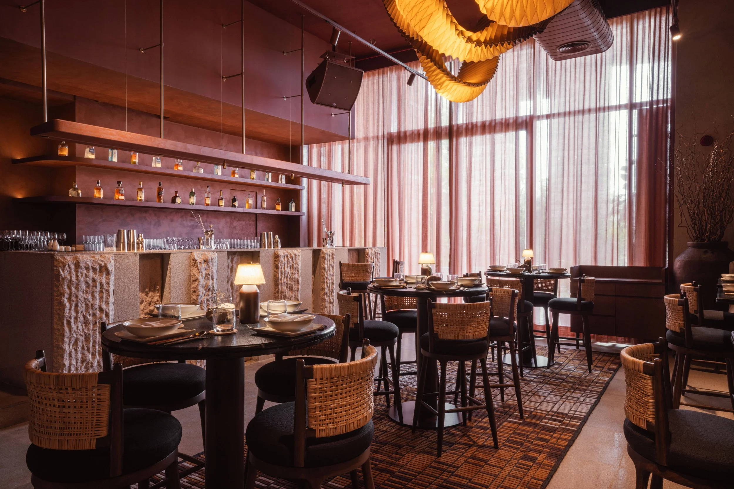 One of the standout features? A breathtaking origami-inspired light installation by Ankon Mitra, made from ombre-dyed silk that flows across the ceiling like a moving sculpture. Every element here is intentional—the river-washed granite flooring, the brushed brass accents, the layered lighting—all designed to create an atmosphere that feels both immersive and effortlessly elegant.