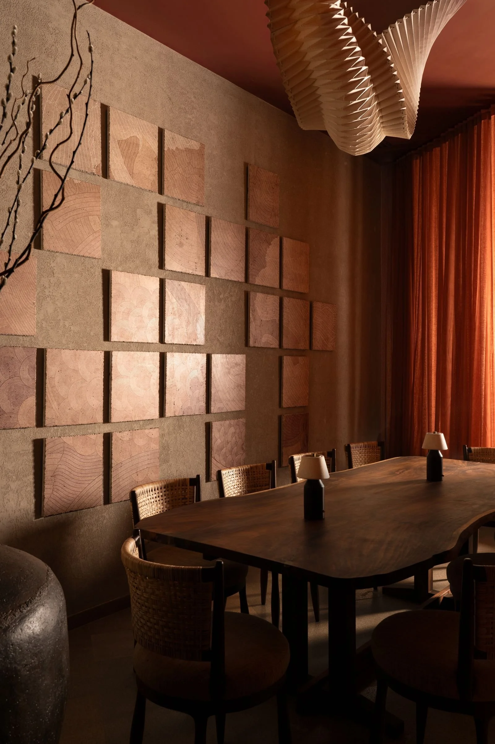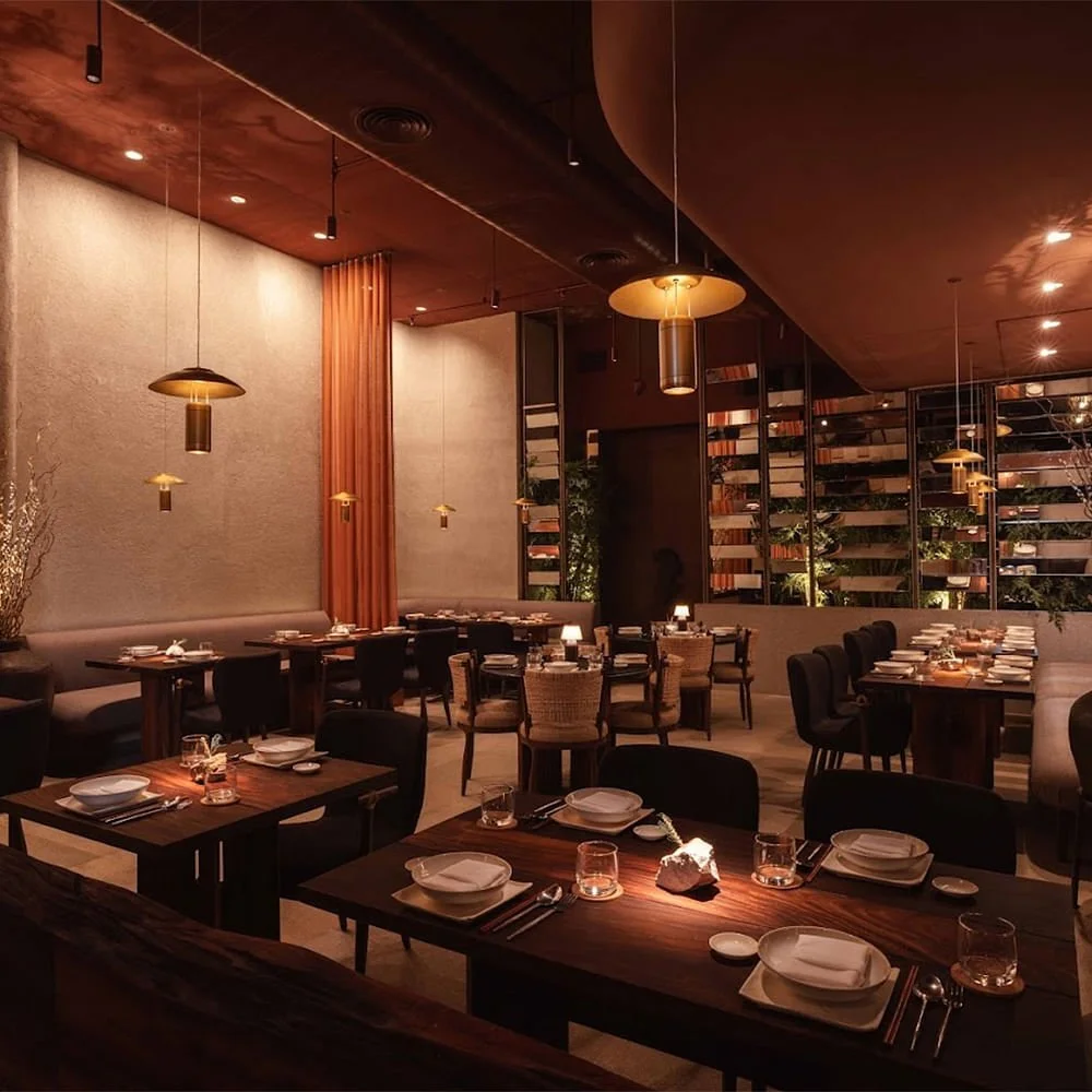 Nestled in the heart of Delhi, Kamei is a stunning collision of Japanese minimalism and warm, earthy textures, imagined by architect Vritima Wadhwa of Project810. The moment you step in, you’re greeted by a beautifully balanced space—textured concrete walls, rattan details, and deep terracotta hues set the tone, while metal lattice screens and soft drapes carve out intimate dining corners.